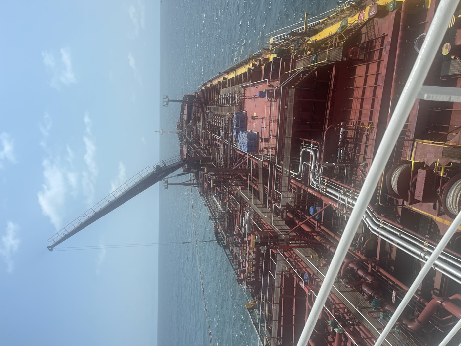 This image depicts a large marine tanker vessel at sea off the coast of Orimedu, Nigeria, viewed from a higher deck of an adjacent vessel