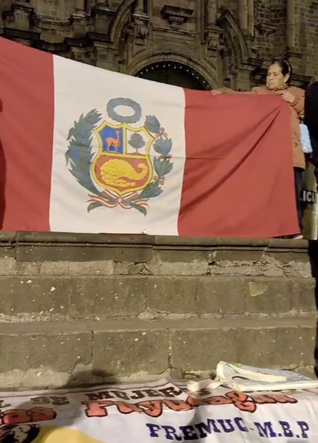 man speaking into a microphone while standing on the steps of a building. The man is wearing a black jacket, dark pants, and a baseball cap. Behind him, people are holding a large Peruvian flag. There is also a banner on the steps with the words "FREMUC-M.B.P" and "Voy a morir" written on it. The building in the background appears to be a church or other historical building. The time of day appears to be nighttime.