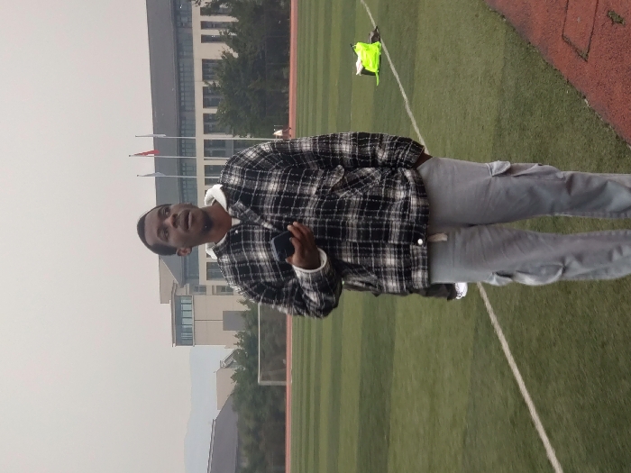 A man stands on a verdant field near a running track, clad in a black and white checkered jacket and gray trousers. A building and flags rise in the background, partially obscured by a hazy sky. A lime-green safety vest lies discarded on the grass. He holds a dark object in his hand, possibly a phone, while facing the camera at an angle.