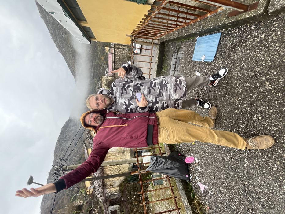 Two adult males are depicted standing on an asphalt surface, posing for a photograph in what appears to be Vranjina, Montenegro. The environment is overcast with low-lying fog or clouds visible among mountainous terrain in the background. The male on the left, with a beard and glasses, wears a maroon jacket with a yellow drawstring hood, tan pants, and brown shoes. His right arm is extended upwards, hand open, while his left arm is around the shoulder of the other male. The male on the right, with blond hair, a beard, and glasses, wears an oversized gray camouflage hoodie, gray pants, and black and white sneakers. He holds a light-colored smartphone in his left hand and makes a "rock on" hand gesture with his right hand. His left arm is around the shoulder of the male on the left. The immediate foreground features a rusty brown metal railing to the right and left. On the asphalt, a small puddle of water is visible. A crumpled blue plastic item lies near the railing on the right. To the left, a black trash bag stands upright, with scattered pink debris on the ground nearby. In the midground, beyond the railing, old stone and stucco buildings are visible, some appearing weathered. A utility pole with multiple electrical wires stands behind the left male. Further back on the right, a yellow building with green trim is partially seen, and a white car is parked in the distance. The background is dominated by mountains partially obscured by atmospheric fog.