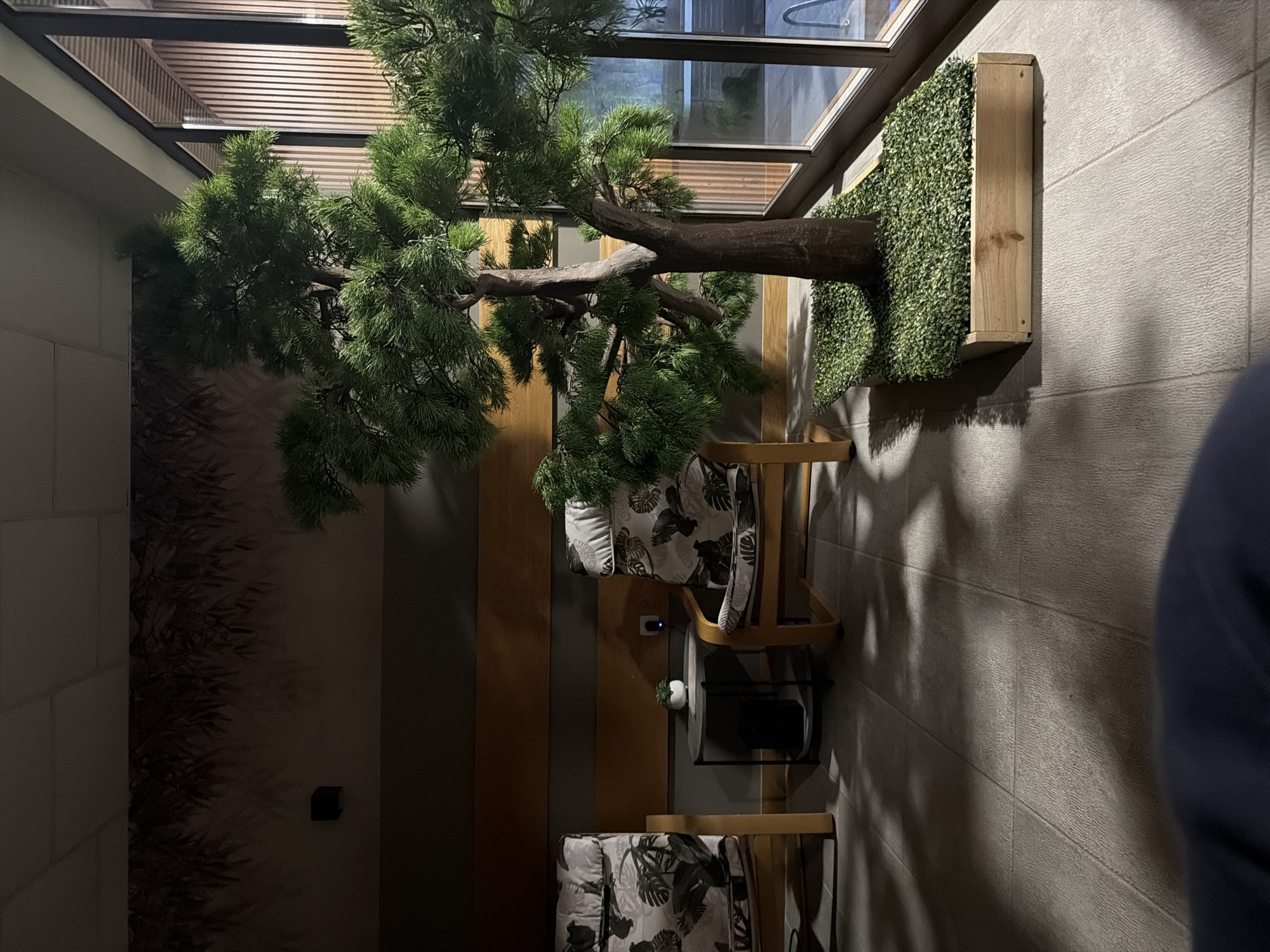 Location: Unknown, Unknown. This scene depicts an indoor relaxation or lounge area, characterized by subdued lighting and a modern aesthetic. The floor is covered with light-grey, textured rectangular tiles. The upper wall features a dark-toned mural resembling hanging leaves, beneath which is a horizontal light-brown wooden panel, followed by a darker grey wall section. On the left, two unoccupied wooden-framed armchairs with grey and white tropical leaf-patterned cushions are positioned. Between these chairs, a small, dark, round side table holds a white potted succulent plant. A white electrical outlet with a blue indicator light is visible on the wall between the chairs. A large artificial evergreen tree, resembling a pine or cedar, stands prominently on the right side of the room in a rectangular wooden planter filled with artificial green turf. This tree is situated next to a large, floor-to-ceiling window that reveals an outdoor area, including a swimming pool with a visible metallic handrail. Shadows from objects and window frames are cast across the tiled floor. The bottom edge of the image shows a blurred, dark blue object, consistent with the leg of a seated individual. No other persons are visible.