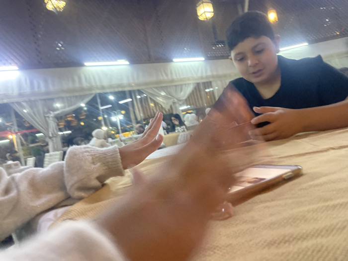 The image depicts an interior scene, likely a restaurant or cafe, situated in Dummar Municipality, Syria. The environment features a textured ceiling with multiple ornamental light fixtures and large windows adorned with white drapes, through which external night lights are visible. In the immediate foreground, a person's left arm, clad in a light-colored knitted sleeve, is motion-blurred, extending from the left with the hand raised, palm facing right, in a gesture consistent with stopping or deflecting. To the right, a young male, estimated to be a child, with dark hair and wearing a black t-shirt, is seated at a table covered by a light-colored tablecloth. His gaze is directed towards the area occupied by the raised hand and a smartphone, which rests face-up on the table, displaying an indiscernible image. The background contains several out-of-focus individuals seated at tables, some with head coverings, and a distant figure in a green shirt, presumably staff.