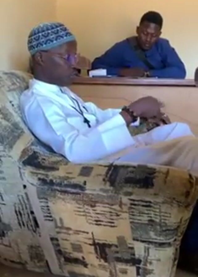A man in a patterned hat and white clothes sits in an upholstered armchair. He wears glasses and a beaded necklace. He is talking. Another man sits at a desk behind him, looking at the first man and taking notes. The room has yellow walls and a light floor.