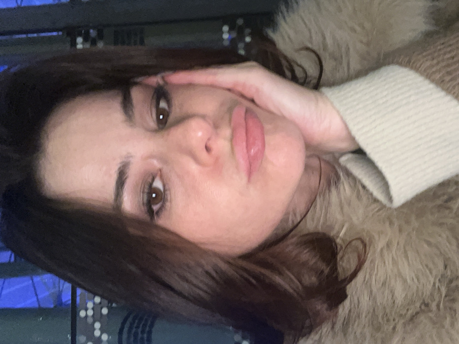 A woman with brown hair and brown eyes poses with her hand on her head. She wears a light-colored sweater and a fur-trimmed jacket or coat. Her lips are slightly pursed. The background is dark with faint, unclear lighting. The image is slightly tilted.