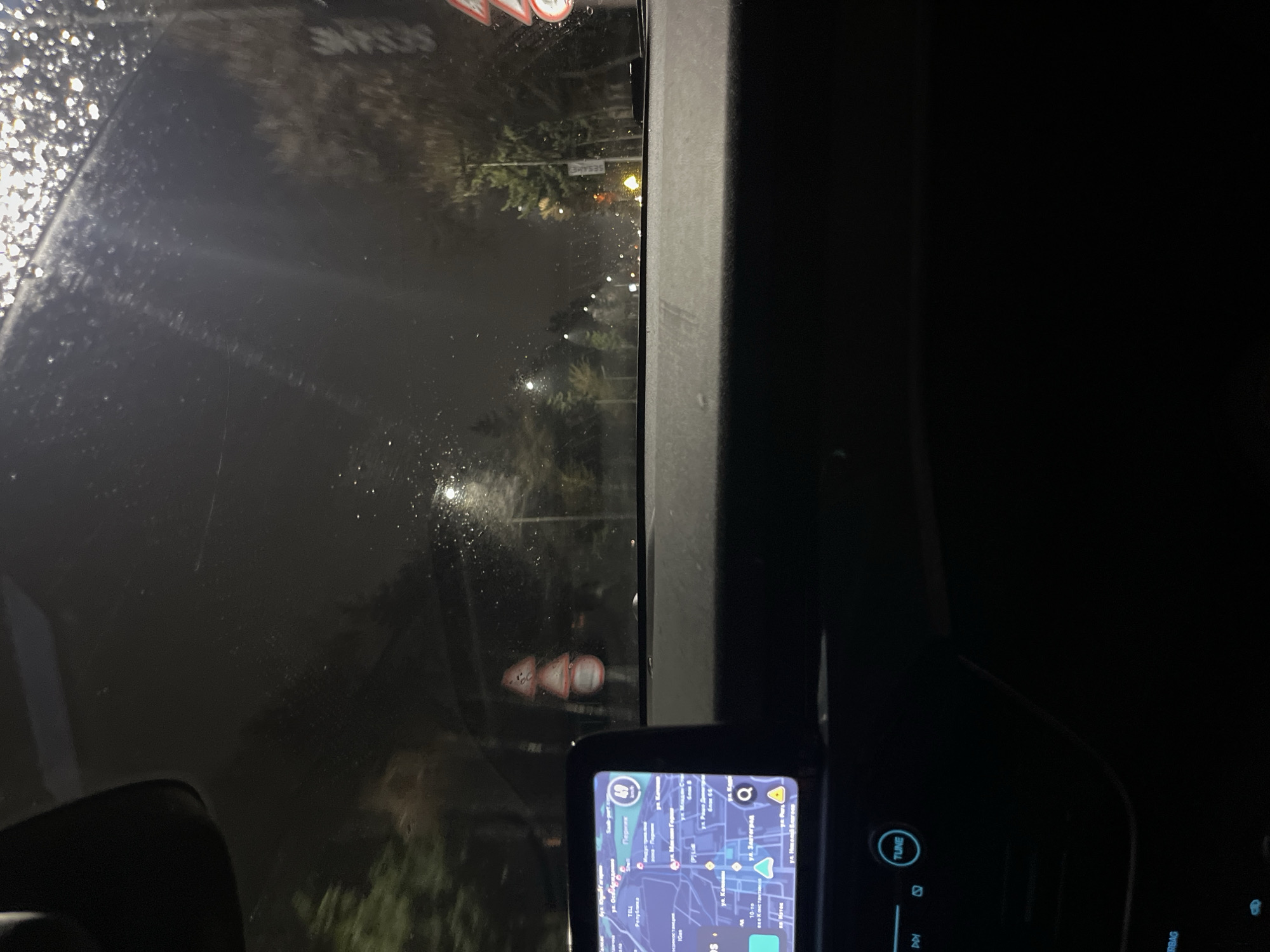 The image presents a nighttime scene viewed from the interior of a vehicle, looking forward through a wet windshield in Pernik, Bulgaria