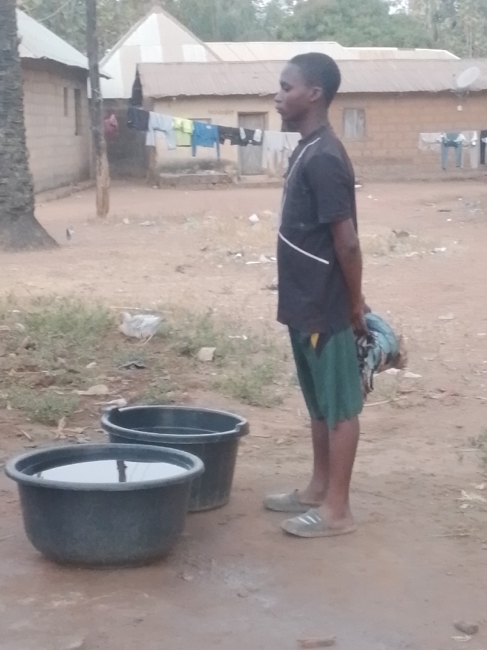 A young man stands next to two plastic tubs filled with water outdoors