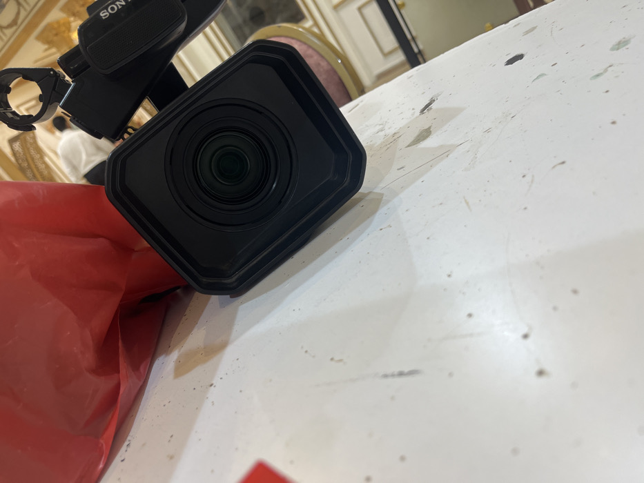 A high-angle, close-up image captures a black Sony camcorder and a crumpled red plastic bag resting on a white, stained surface