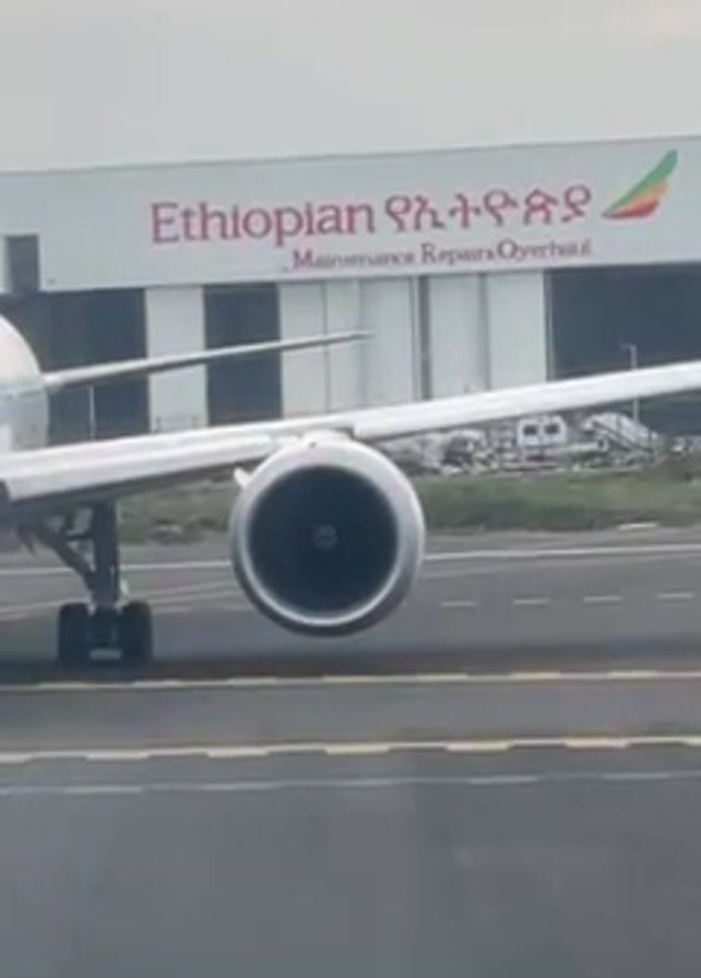 n airplane at an airport, the engine of which is clearly visible, with an "Ethiopian Maintenance Repair and Overhaul" building in the background