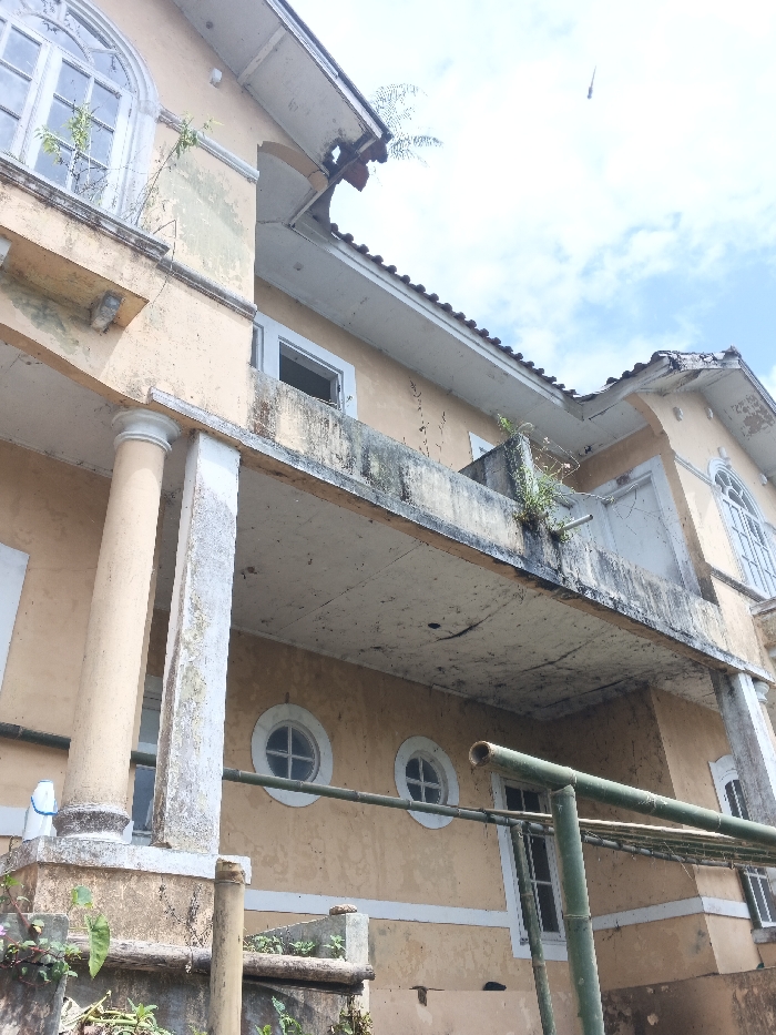 A weathered multi-story building stands under a partly cloudy sky. The structure shows signs of age and neglect with peeling paint and plant growth on the ledges and roof. Distinctive circular windows punctuate the facade, while upper levels have rectangular openings, some without glass. A makeshift bamboo structure is in the foreground, suggesting a clothesline or similar purpose. The overall impression is one of faded grandeur.