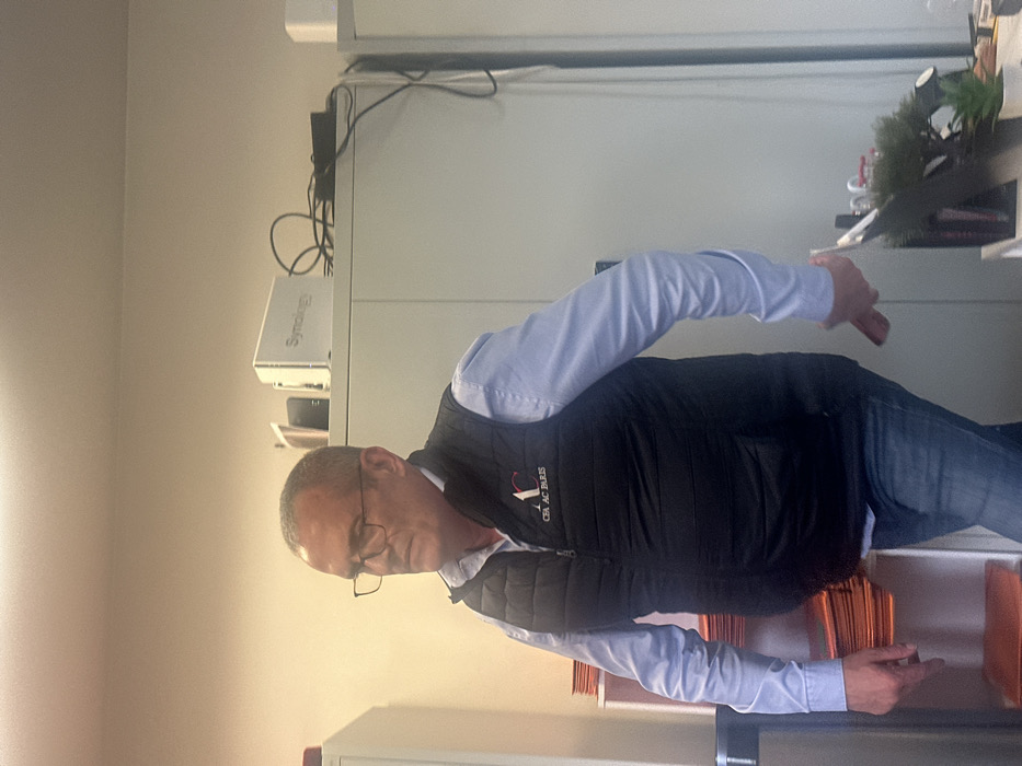 This image depicts an indoor office or workspace environment, purportedly located in Aubervilliers, France. The central subject is a middle-aged male, approximately 45-60 years old, with short, greying hair and rectangular black-framed glasses. He is dressed in a light blue collared long-sleeve shirt, a black puffer vest featuring the embroidered logo "CEA AC PARIS" in red and white on the left chest, and blue jeans. His head is turned to his left, and his gaze is directed off-frame, indicating he is looking at something or someone beyond the camera's view, with a serious expression. His body is angled towards the right side of the frame, suggesting he is in the process of turning or walking. His right arm is bent, with his partially visible right hand pointing downwards and slightly to the right, index finger and thumb extended. The background features light-colored walls and ceiling. To the right, two light-grey metal storage cabinets or filing cupboards are visible. The top surface of the rightmost cabinet holds a white Synology Network Attached Storage (NAS) device, alongside several black cables and other small electronic devices. To the left, a multi-tiered open shelving unit contains numerous stacks of orange-colored documents or folders. In the immediate foreground on the right, a desk or surface displays a small artificial plant arrangement, a red Marlboro cigarette pack, and other miscellaneous office items.