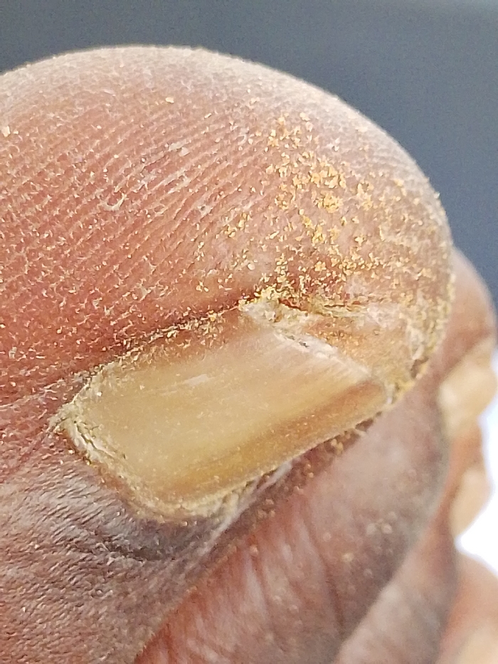 A close-up shows the tip of a dark-skinned toe, likely the big toe