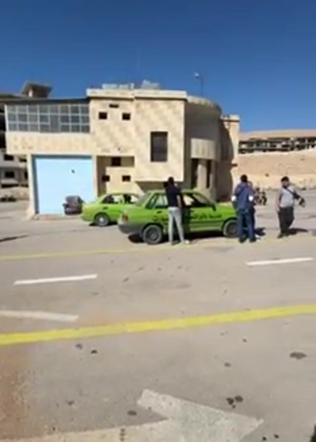 n outdoor scene with a light green car parked on a paved surface marked with white lines. There are several people standing around the car, appearing to be engaged in conversation or preparation. Another similar green car is parked nearby. In the background, there is a building made of light-colored stone and a hillside with a partially constructed building. The weather appears sunny and clear.