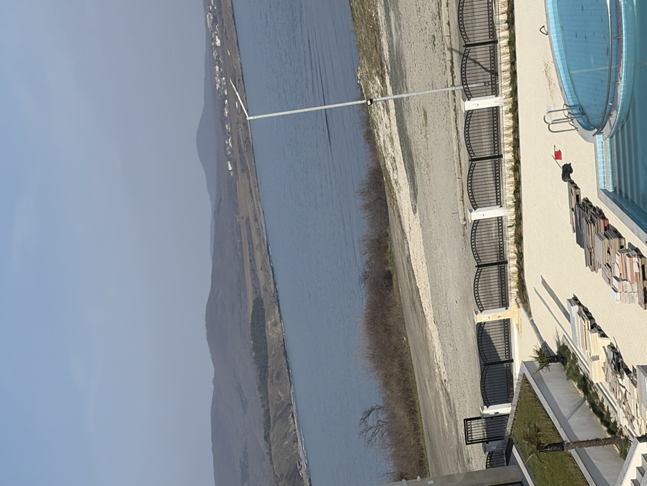 The image presents a coastal overview in Ahtopol, Bulgaria, under a clear, light blue sky. In the immediate foreground, a light-blue swimming pool, partially filled with water, features integrated steps and a metal handrail. Adjacent to the pool is a light-colored paved patio area, upon which several stacks of construction materials, appearing as stone or tile slabs on wooden pallets, are organized. A black, wrought-iron fence with decorative arches and white concrete support posts separates this paved area from a higher, unpaved ground level. A single black metal gate is visible within this fence on the left. To the far left, a section of a building or retaining wall is visible, edged with green grass and two small palm trees. The midground features an unpaved, light-colored dirt or gravel road that runs horizontally, parallel to the coastline. Sparse, dry-looking bushes and trees line the terrain between this road and the water's edge. A tall, white lamppost with a single horizontal light fixture extends upwards from the right side of this unpaved area. The Black Sea occupies a significant portion of the image's midsection, displaying a calm, blue surface with subtle wave patterns. In the background, a distant coastline with rolling hills covered in sparse, dry vegetation recedes into the haze. A distinct cluster of white and light-colored buildings, indicative of a settlement, is visible along the distant coastline on the far right. No individuals are present in the scene.