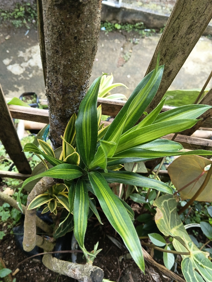 - "A green and yellow Dracaena plant with vibrant striped leaves emerges from a weathered tree trunk" by FM-ffcoN2, licensed under CC BY 4.0