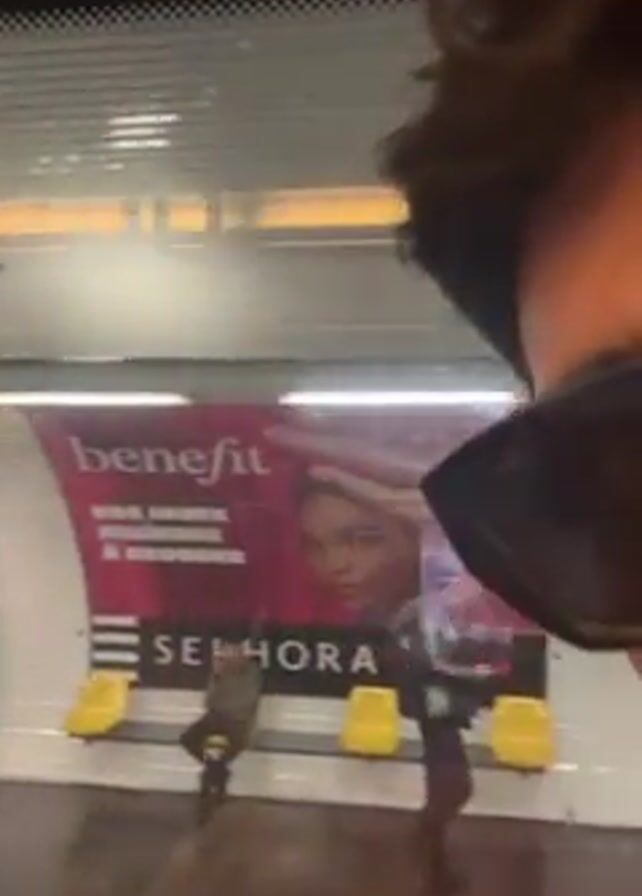 A person is looking out of a window on a moving train at a subway station. The person is wearing sunglasses and a mask. Through the window, a green vending machine, a poster for "Rue des...", and other posters are visible. There are also yellow benches in the station. The train appears to be moving past the station.