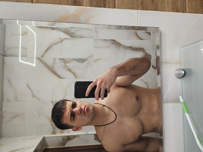 A shirtless male, approximately 20-30 years old, with short dark hair and a muscular build, is depicted in a mirror selfie taken in a bathroom in Atiya, Bulgaria