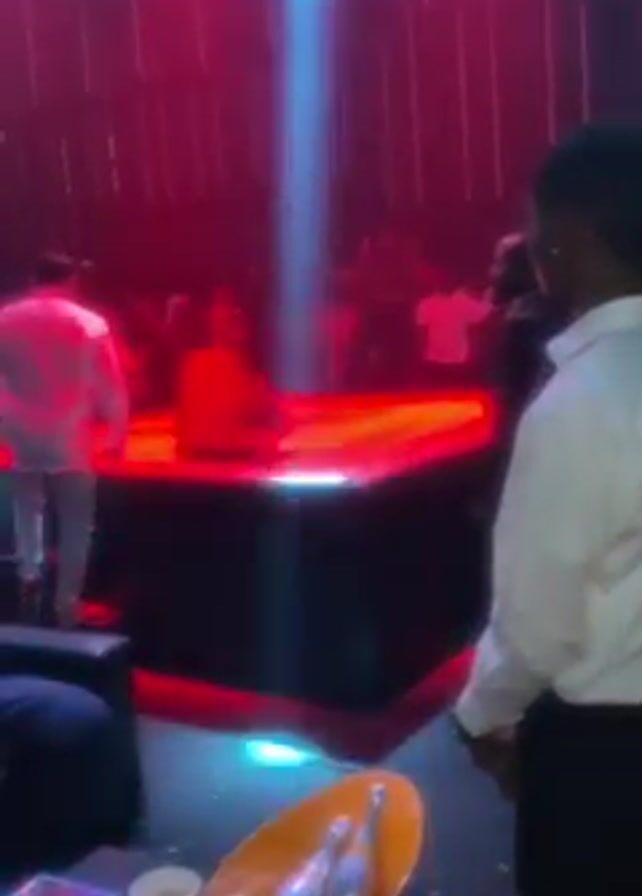The video takes place in a nightclub. A person in a white shirt and black pants is standing on the side, while in the center of the room, there is a raised platform illuminated in red light. Several people are gathered on and around this platform, some of whom appear to be dancing or moving. A yellow ice bucket with bottles inside is visible in the foreground. The lighting is dim, with vertical lights adding to the club atmosphere.