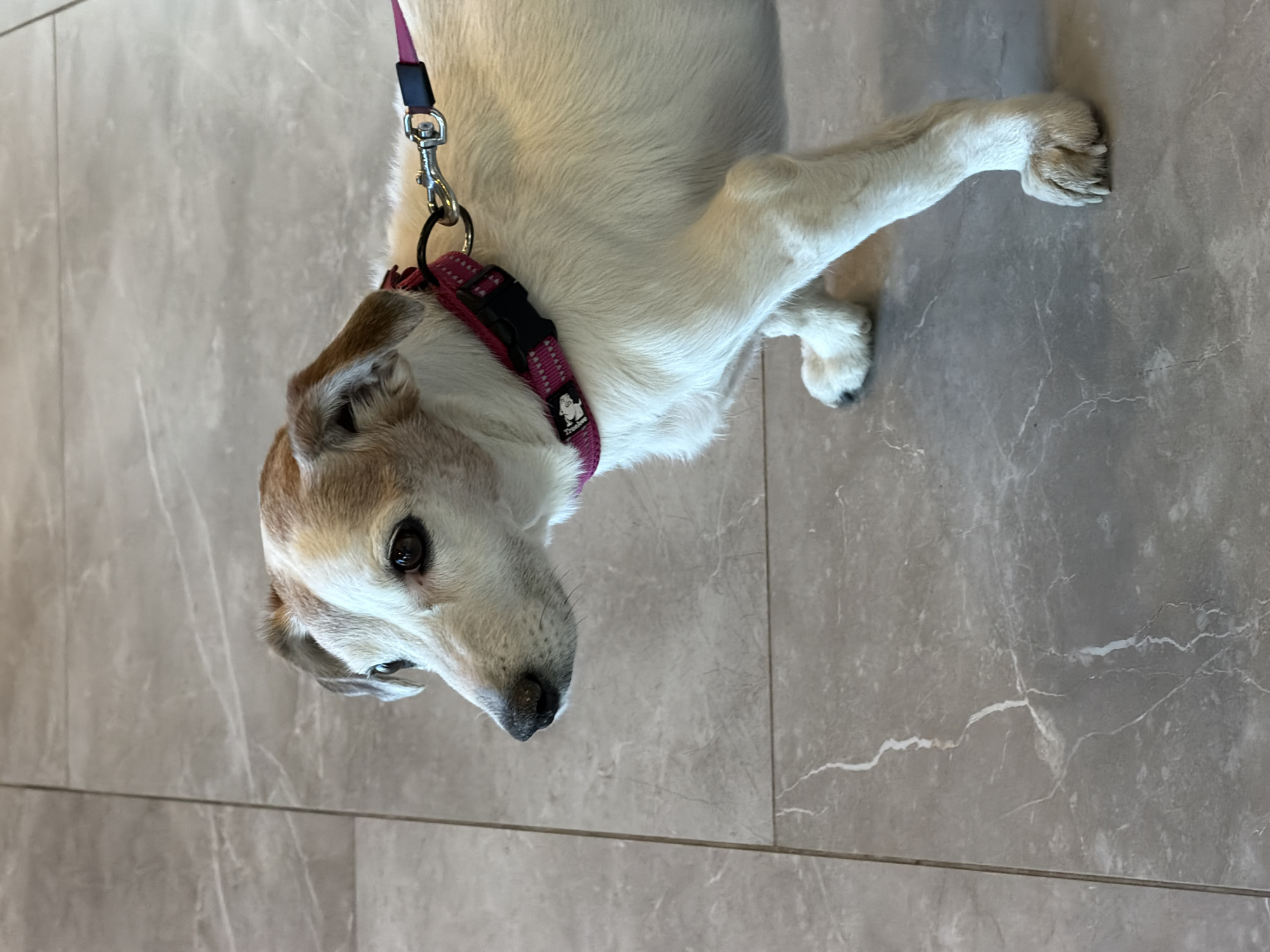 A medium-sized, primarily white dog with tan markings on its head and ears is standing on a grey, tile floor with veined patterns