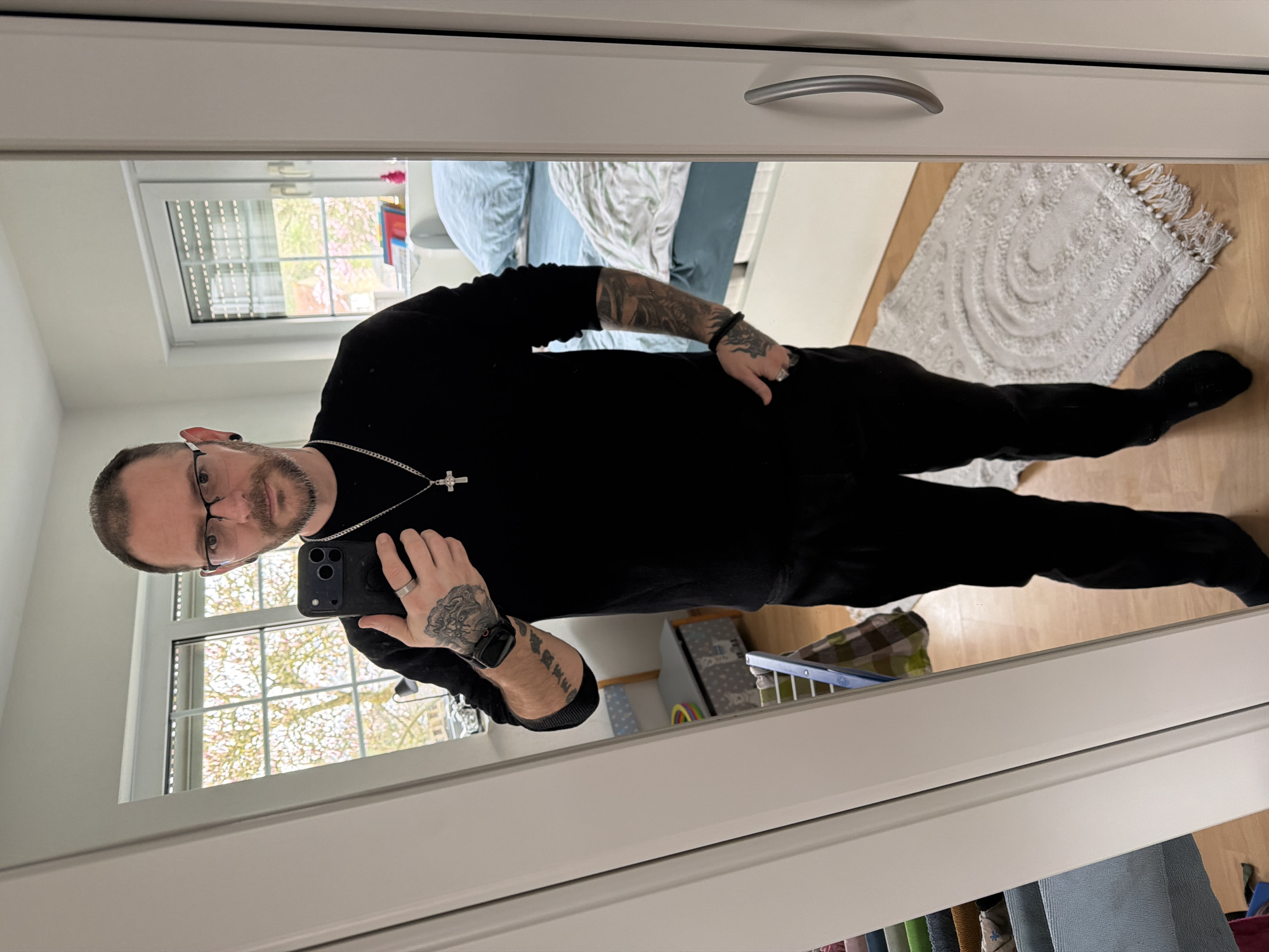 An adult male is depicted in a mirror selfie taken within a residential interior in Trassem, Germany. The male stands full-body, facing the mirror, holding a dark-colored smartphone in his left hand. He has short brown hair, a beard, wears eyeglasses, and has ear gauges. His attire consists of a black long-sleeved shirt, black trousers, and dark footwear. He wears a silver chain with a cross pendant, a silver ring on his left ring finger, a black smartwatch on his left wrist, and a black beaded bracelet on his right wrist. Extensive tattoos are visible on both forearms and hands. His right hand is placed into his trouser pocket. The reflected environment reveals a room with light-colored walls and light brown wooden flooring. A large window is visible behind the male, showcasing outdoor deciduous trees with light green foliage, suggesting spring or early summer, and a partial view of an adjacent structure. The window is equipped with external roller blinds. To the right of the male, a bed with a light blue fitted sheet and a light-colored duvet is partially visible. A rectangular, light-colored textured rug featuring a patterned design is on the floor near his feet. A white cabinet with a silver handle is positioned on the far right. To the left of the male, a child's small chair, a patterned storage box, and a clothes drying rack are partially reflected.