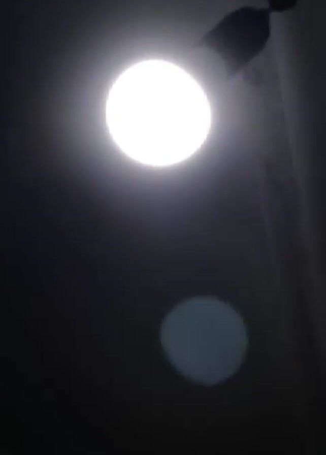 light bulb illuminating a room. The light source is bright and round, and a slightly dimmer circular reflection is visible below. The bulb appears to be attached to a fixture on the ceiling. The room itself is dark, with the ceiling surface partially visible. An audio track is present, but the content is not described.