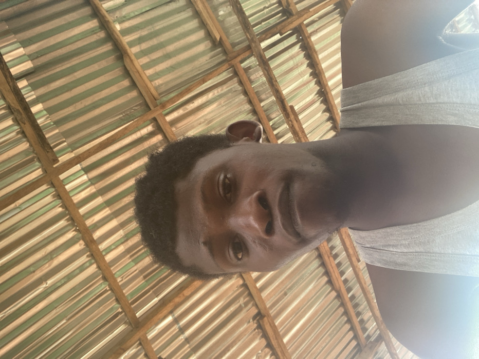The image depicts a close-up of a dark-skinned adult male with short, dark, curly hair, facing directly towards the camera with a neutral expression. He is wearing a light-colored, possibly grey, sleeveless tank top. The background consists of an overhead roof structure composed of corrugated metal sheets with alternating light green and white stripes, supported by visible wooden beams and rafters. The lighting suggests daylight conditions under this covered area. The scene is located in Agege, Nigeria.