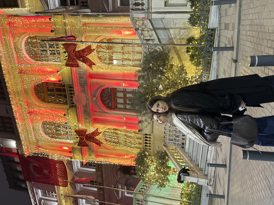 The image depicts a nighttime street scene in front of the Pera Palace Hotel in Beyoğlu, Istanbul, Turkey. The hotel's ornate facade is extensively decorated with festive lighting, featuring red illumination washing over the architectural elements and numerous strands of warm white string lights draped over windows, pillars, and balustrades. Three large, red, illuminated bow decorations are affixed to the upper facade. A Turkish flag hangs vertically from a pole on the building's left side. In the foreground, two adult females are standing side-by-side on a cobblestone sidewalk, posing for the camera. The woman on the left wears a dark leather-style jacket, a light-colored striped scarf, dark wide-leg trousers, and carries a dark brown tote bag; she has her head tilted with a slightly pursed-lips expression. The woman on the right wears a long black coat with fur-trimmed cuffs, tied at the waist, and holds a white-cased smartphone in her left hand while looking directly forward. Illuminated trees and shrubs are visible behind them, flanking a grand stone staircase that leads to the hotel entrance. Two dark cylindrical bollards are present on the sidewalk in front of the individuals.