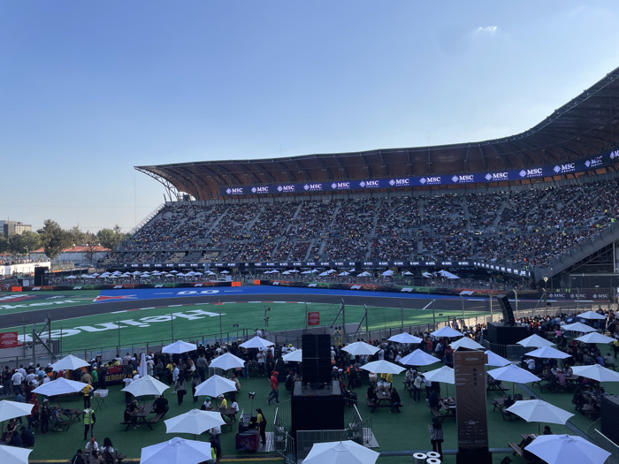 The image depicts an outdoor event at the Autódromo Hermanos Rodríguez in Mexico City, Mexico