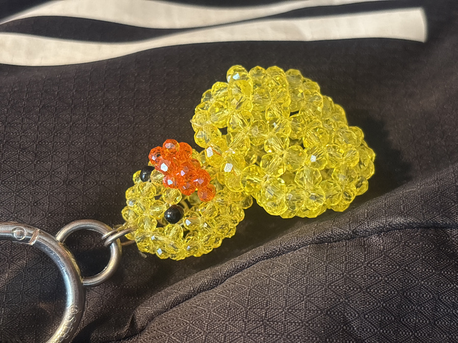 - "A beaded keychain shaped like a yellow duck with an orange beak and black eyes rests on a textured brown surface" by FM-wFXMq1, licensed under CC BY 4.0