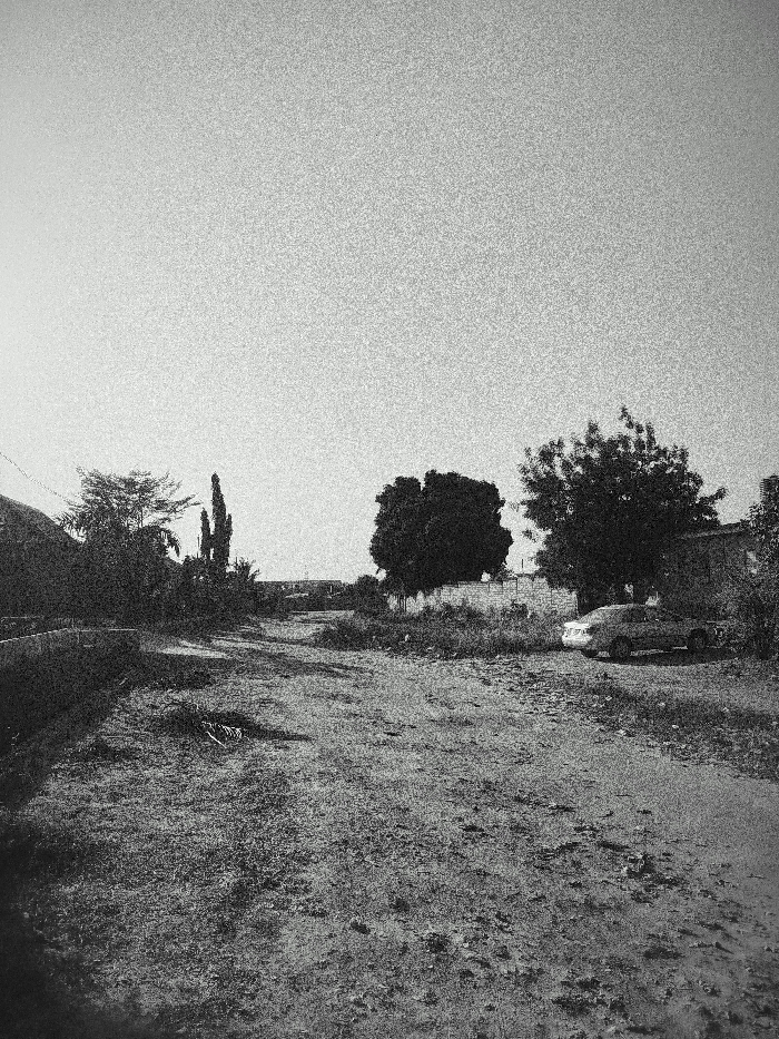 This image depicts an outdoor, static scene in Narayi, Nigeria, rendered in black and white with significant grain. The foreground consists of uneven, light-colored dirt or sandy ground with sparse, dry vegetation and scattered debris. No individuals are present. In the midground, a low masonry wall extends from the left, behind which various trees and tall, slender plants are visible. To the right, a light-colored sedan, possibly silver, is parked parallel to another low wall or fence, facing towards the right. Behind the parked vehicle and wall are several dense trees with dark foliage, and a partial structure is faintly visible further right. The background shows a distant horizon line with indistinct structures, indicating a populated area. The sky is uniformly light gray, occupying the upper two-fifths of the frame, with visible digital noise. Shadows on the ground suggest a light source from the upper-left of the frame.