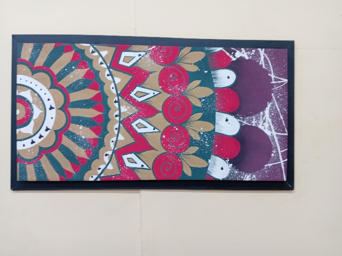 A rectangular painting with a black frame hangs on a light beige wall. The painting features a colorful, semi-circular, patterned design. The left side showcases white circles, tan, and green shapes. Progressing right, the design incorporates red, tan, and green. The rightmost part is a dark purple with white streaks. The overall effect is a vibrant and abstract composition.