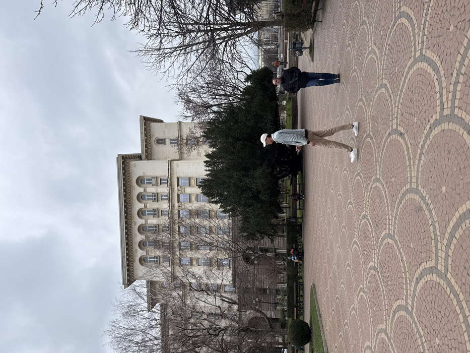 The image depicts an outdoor urban scene in central Sofia, Bulgaria, centered on the park area adjacent to the former Party House, now part of the National Assembly. The prominent multi-story, light-colored building with numerous windows, including distinct arched windows on its upper floors, is the former Party House, dominating the background under an overcast sky. The foreground consists of a large paved surface with a repeating circular pattern created by reddish-brown and lighter-toned cobblestones. Two adult males are walking across this paved area from right to left. The male in the immediate foreground, dressed in a white baseball cap, a light blue-grey jacket, tan trousers, and white sneakers, is observing a mobile phone held in his right hand. Further into the midground, to the right of the first male, a second male in a dark jacket, blue jeans, and dark shoes walks with a forward gaze. Behind these individuals, a park setting features several bare deciduous trees and one large, dense evergreen tree. Multiple park benches with wooden slats and dark frames are visible beneath the trees, occupied by several indistinct individuals who are seated. A dark-colored waste bin is positioned near the second walking male.
