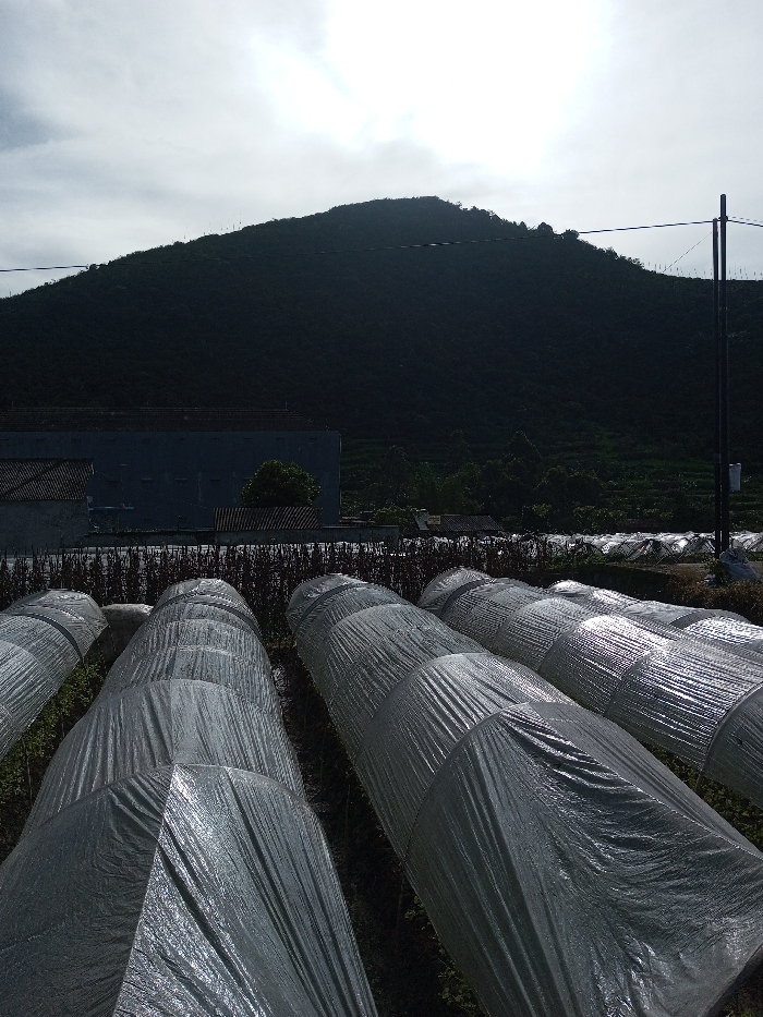 The image displays an agricultural landscape in Salai Har Htan, Myanmar. In the foreground, numerous parallel, elongated tunnel structures covered with reflective, crinkled silvery-grey sheeting extend across a dark ground surface. Behind these covered rows, a field of darker, dense vegetation is visible, bordered by a partial light blue building with a dark roof on the left. A black utility pole with an overhead power line is situated on the right side of the midground. The background is dominated by a large, dark green, tree-covered mountain rising sharply against a bright, overcast sky. No people are present.