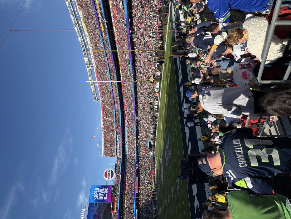 A football stadium packed with fans on a sunny day. The field is visible, with painted lines and logos. A stadium billboard is visible, promoting "Super Bowl LX". Spectators wearing jerseys and casual clothing occupy the stadium seating. A few fans wear blue and green, suggesting support for the Seattle Seahawks. The sky is clear blue.