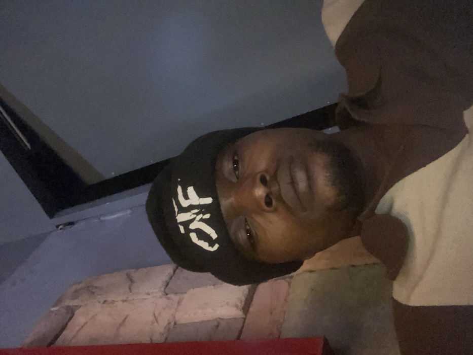 An African-American man wearing a black beanie with the word "ONE" in white letters is looking down at the camera. The shot is angled, with his face partially resting on a brick or stone surface. His expression is neutral, and he has a short beard. The background is a mix of neutral tones, including a wall and a corner of what looks like a room. The lighting appears to be dim. He is wearing a light-colored t-shirt.