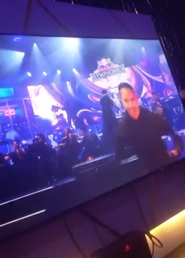 A medium shot of a large screen shows a concert performance. The screen displays an orchestra with electronic musicians and DJs. A man in a black shirt is featured prominently on the screen. He is smiling and gesturing as if conducting or emceeing. Later, the screen shows a woman in a red outfit dancing with a man. The room is dark with blue lighting, and there's a white, angled light fixture on the wall. A black speaker box sits in the foreground.