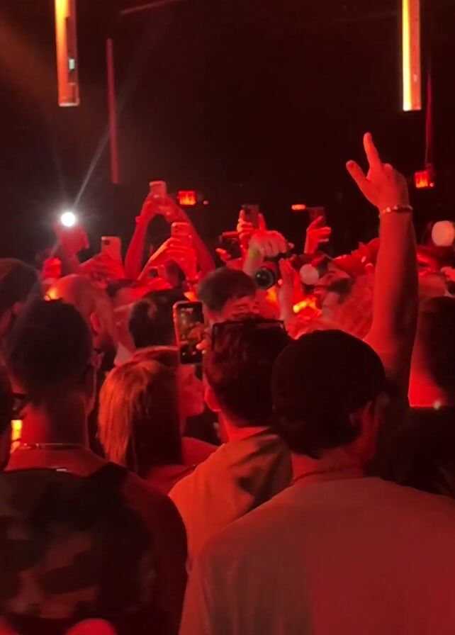 crowded nightclub with red lighting. People are packed together, many holding up their phones to record. Most of the people are facing the same direction. Some are raising their hands in the air. The club has tall, slender light fixtures. Some greenery can be seen along the right side of the frame. There is also a faux candle in the foreground.