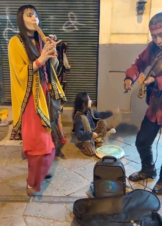 A street band performs outdoors on a cobblestone surface in front of a metal roller door. The band consists of three individuals: an adult woman playing a flute, an adult man playing a violin, and a young child striking a drum with a mallet. The woman is wearing a yellow and black shawl over a red dress. The man wears a maroon jacket, jeans, and a headband. The child sits on the ground in patterned pants. A portable speaker and an open musical instrument case sit on the ground near them. The area is lit by streetlights, creating a mixed lighting environment with some shadows. The background includes parts of buildings and other street furniture.