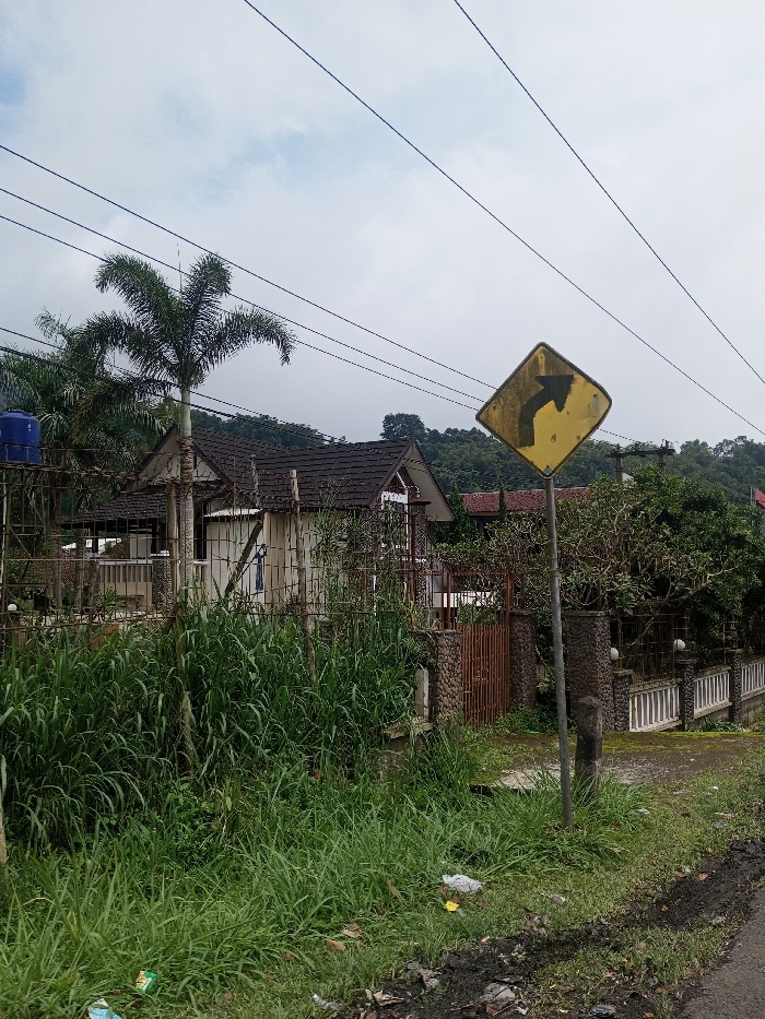 A house stands partially hidden behind overgrown greenery and a fence. The structure has a dark roof and white walls with visible architectural details. A palm tree rises next to the house. Overhead, power lines stretch across the sky. A yellow, diamond-shaped road sign with a curved arrow is positioned prominently on the right. The foreground shows overgrown vegetation and roadside debris. A stone fence with white accents is visible further to the right.