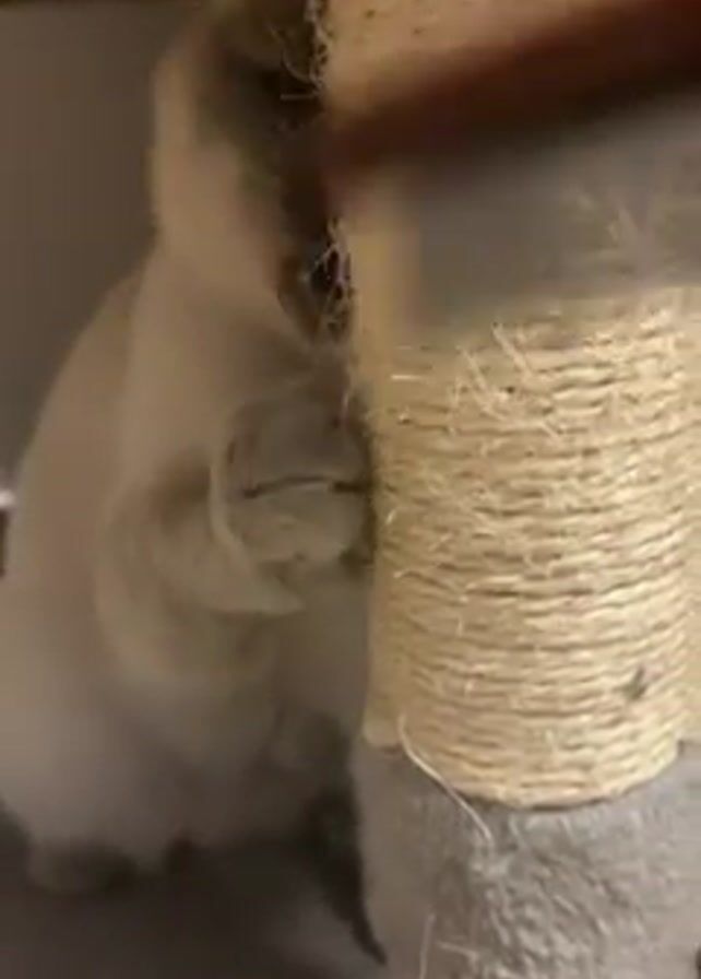 A close-up shot shows a light-colored cat with dark brown markings scratching at a sisal-covered scratching post