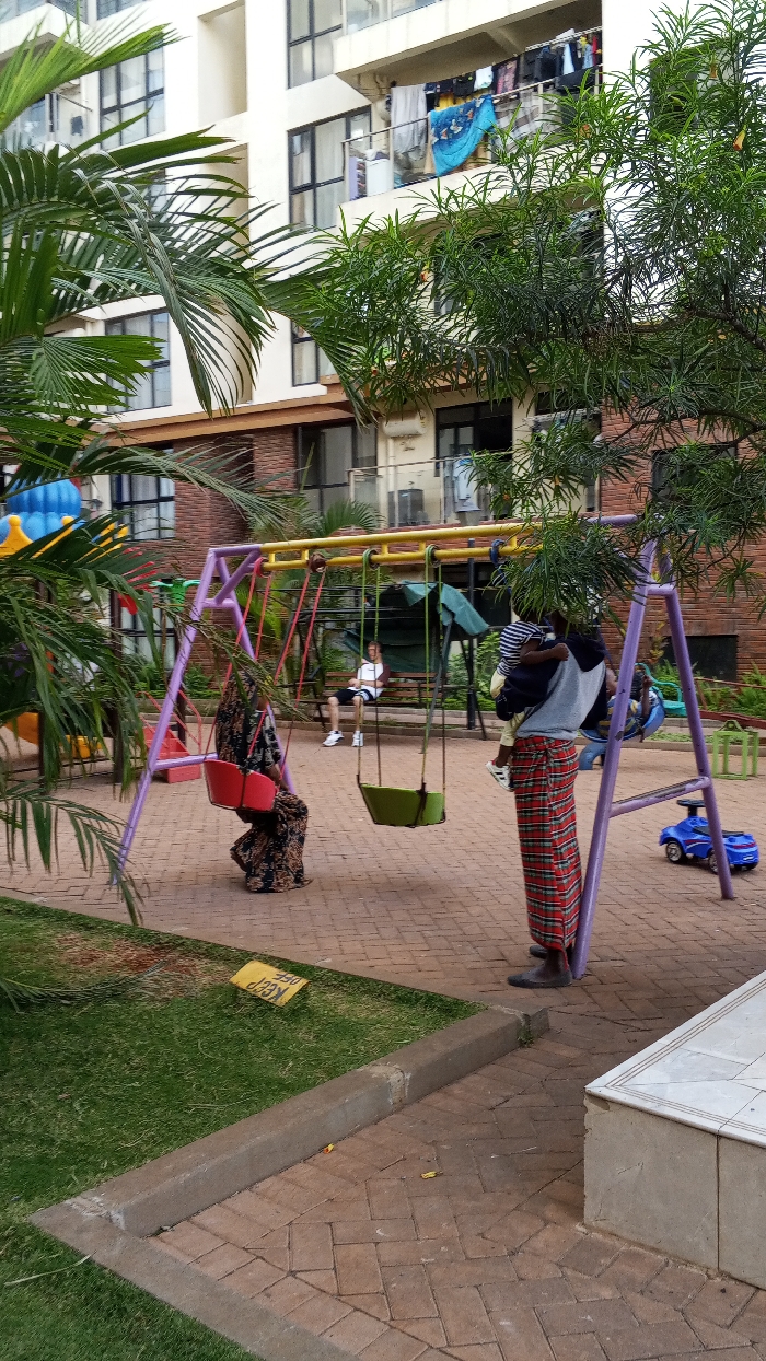 A playground with a swing set occupied by three people. One person is seated, wearing a dark floral patterned gown. Another person is standing, holding a child in striped clothing. A third person is sitting on a bench in the background. A toy car rests beside the swing set. Lush green foliage surrounds the playground, and a multi-story building stands in the background with laundry hanging on a balcony. A sign on the ground reads "KEEP OFF." The ground is paved with brown bricks.