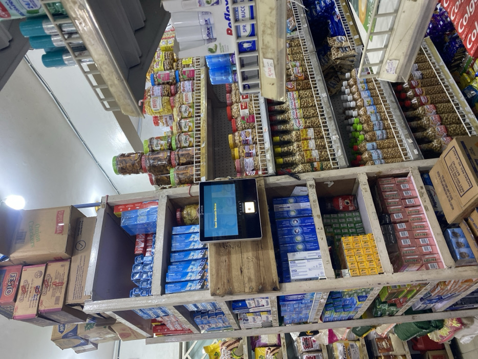 A cluttered grocery store shelf displays a variety of products. Jars of nuts and snacks line the top shelf, while below are boxes of toothpaste, coffee, and cigarettes. Crackers and other grocery items are also visible. A digital kiosk for scanning barcodes is affixed to the shelf. Brands like Colgate, Nescafe, and Betadine are evident. The shelves are made of wood and appear aged, indicating a possibly older establishment.