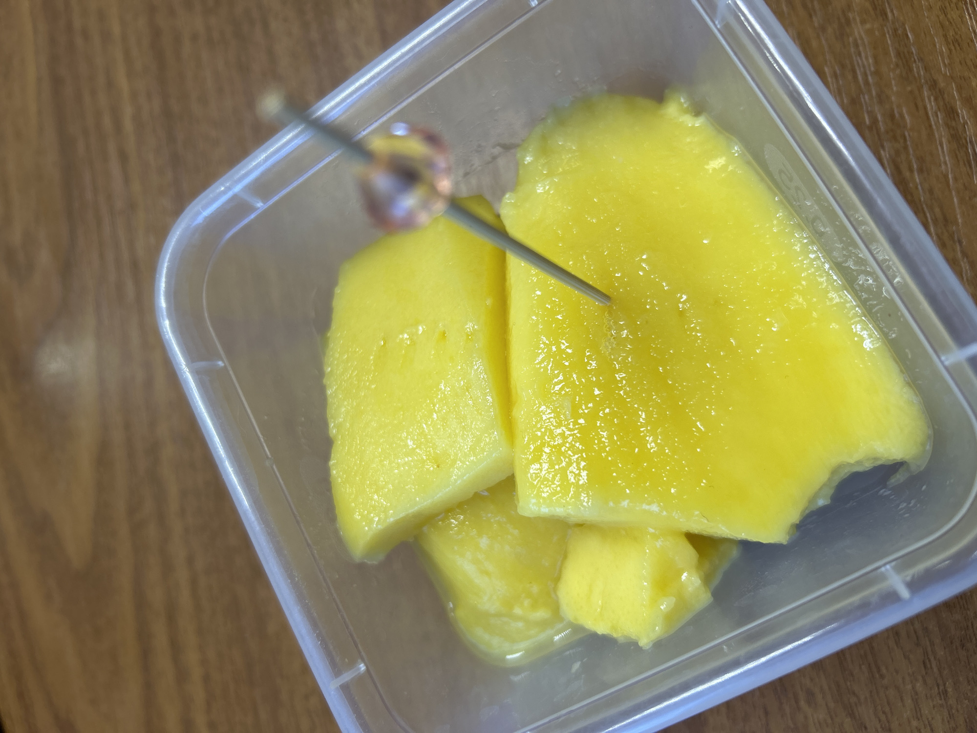 A top-down shot shows a clear, rectangular plastic container holding several pieces of sliced mango