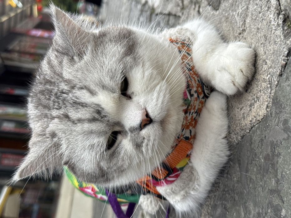 A silver tabby cat, appearing to be a British Shorthair or Scottish Fold mix, is depicted in a medium shot, lying on a paved surface. The cat's fur is predominantly white on the chest, belly, and paws, transitioning to a grey-and-white striped tabby pattern on its head, ears, and visible back. Its eyes are partially closed, contributing to a calm or slightly disengaged expression. The nose is pink. The cat is wearing multiple layers of clothing. An inner garment, possibly a collar or sweater, is orange with a small floral pattern. Over this, a light-colored, textured, possibly knitted, vest-like garment is visible. The outermost layer is a vibrant harness with a geometric or abstract pattern featuring green, yellow, pink, and purple hues. A purple leash or strap is visible on the cat's left side. Its front paws are tucked beneath its body. The immediate ground beneath the cat is composed of irregularly shaped grey and light grey flagstones or cobblestones, suggesting a pedestrian walkway or street. The background is blurred but indicates an urban setting with building facades. Faint red elements, possibly lanterns or signage, and hints of green are discernible, consistent with a commercial street or public area. The lighting suggests daylight. The scene takes place in an urban outdoor environment within the city of Guilin, China.
