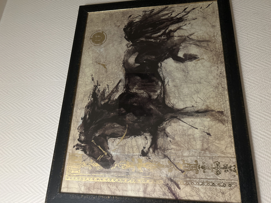 A framed painting depicts a dark figure riding a horse. The horse and rider are rendered in expressive brushstrokes with a dark palette. The background is textured with hints of gold. The horse appears rearing, its form energetic. The composition is an abstract portrayal of the subject.