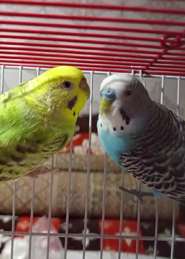 A close-up shot shows two budgerigars in a cage with red bars