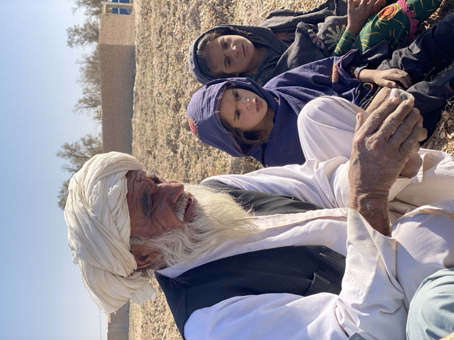 - "An elderly man, a young girl, and a slightly older girl are seated on dry, light brown, barren ground in Mandisar, Afghanistan" by FM-B5wmg2, licensed under CC BY 4.0
