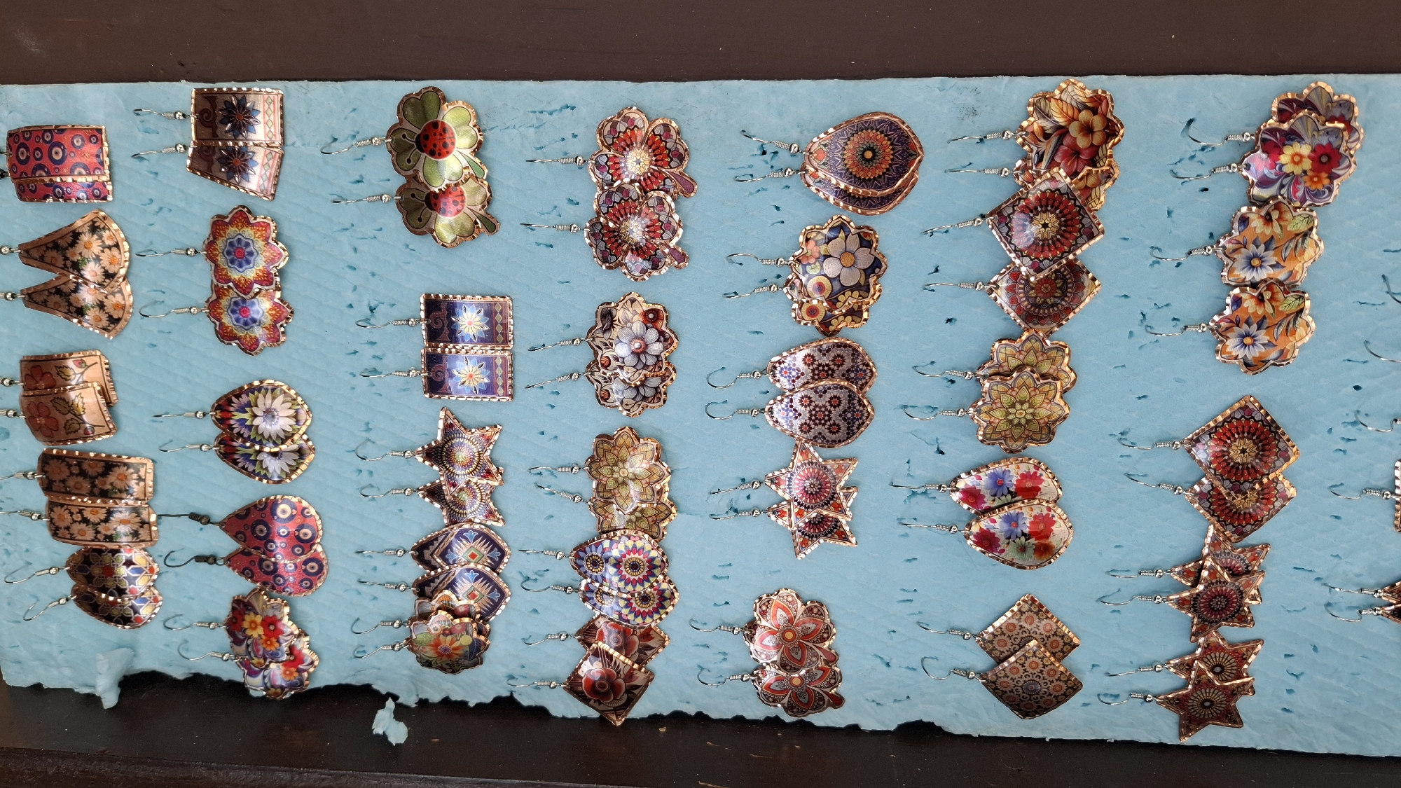 - "The image displays a vertical arrangement of approximately 45 pairs of dangle earrings, meticulously presented on a light blue, textured board" by FM-5Zve72, licensed under CC BY 4.0