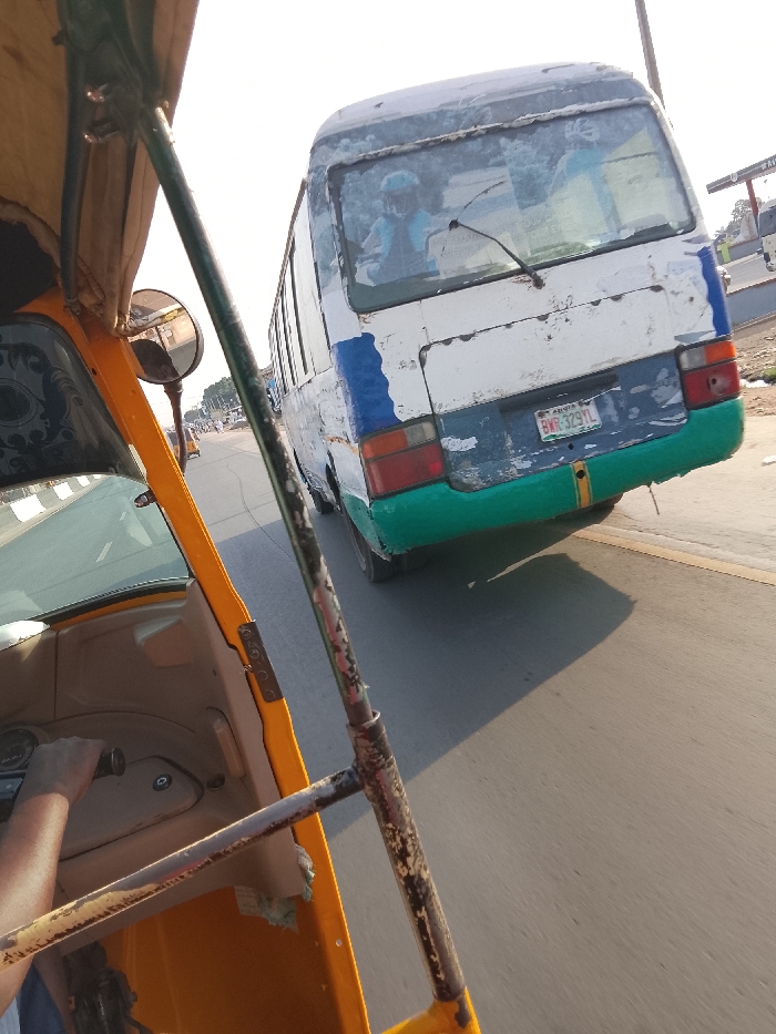 From the perspective of a yellow tricycle, a white bus is partially captured in the frame. The bus has a blue and green stripe at the rear and a license plate reading "BWR-329YL." Inside the bus, a person is visible wearing a blue head covering. The tricycle's handlebars and side mirror are visible in the foreground. The setting appears to be a road with other vehicles in the distance, under a slightly overcast sky.