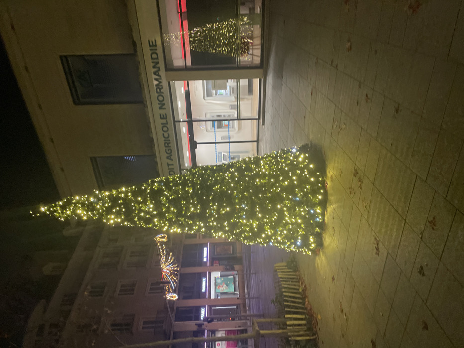 A tall Christmas tree decorated with numerous warm white lights stands in front of a building. The building houses a Credit Agricole Normandie branch with glass doors reflecting a second smaller tree. Across the street, buildings are visible, one adorned with a decorative light display. The scene is lit by streetlights, casting shadows on the paved walkway where fallen leaves are scattered. A bench sits near the tree, and the overall atmosphere is festive and nighttime.