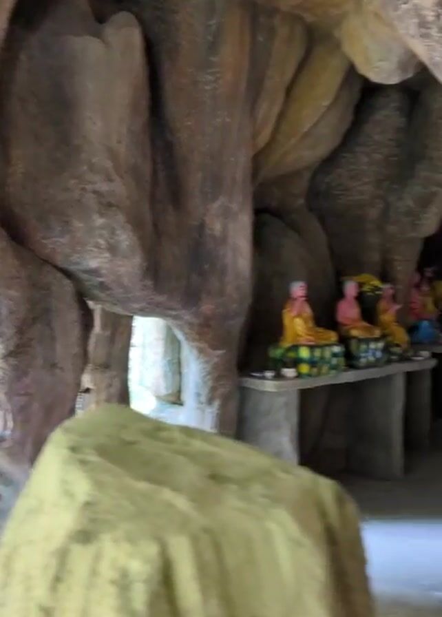 interior of a cave with various statues of Buddhist figures. The cave walls are rough and textured, appearing to be made of stone or a similar material. There is an elephant statue near the entrance of the cave. Further inside, there are several tables with multiple statues of monks or deities. One of the statues, located in a small niche, features a figure in a red robe standing on a lotus base, holding a long staff. The cave floor is smooth and appears to be concrete. The lighting inside the cave is dim.